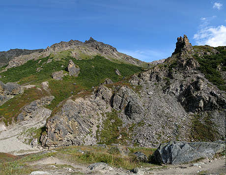 | Über die Bizarren Fellsformationen ins Tal, am Skookum Volcano Trail "Alaska" |