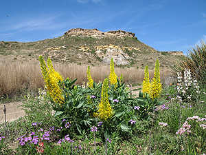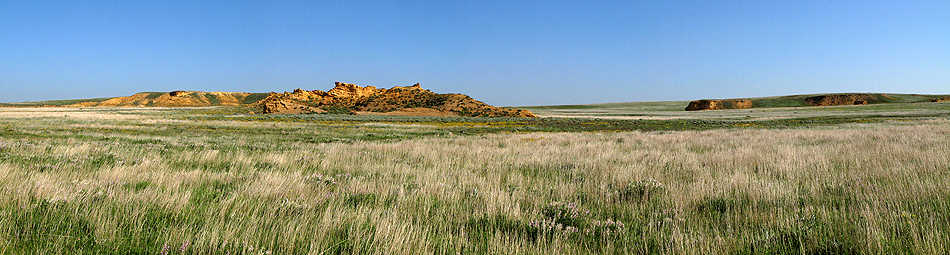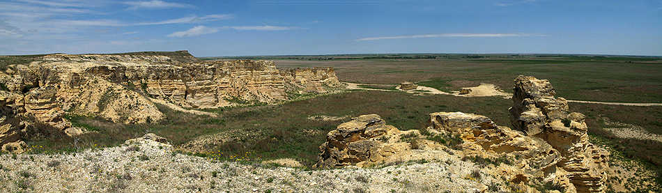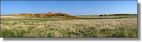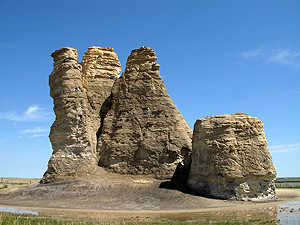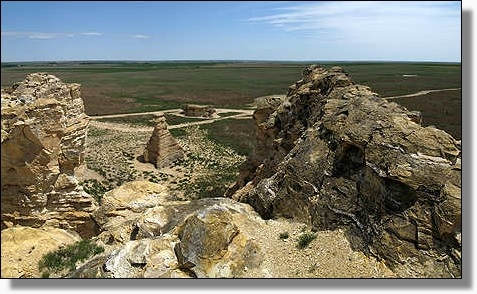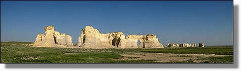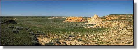 Mitten in der Ebene, erheben sich die mächtigen Monument Rocks. |