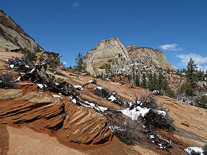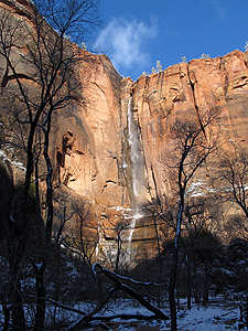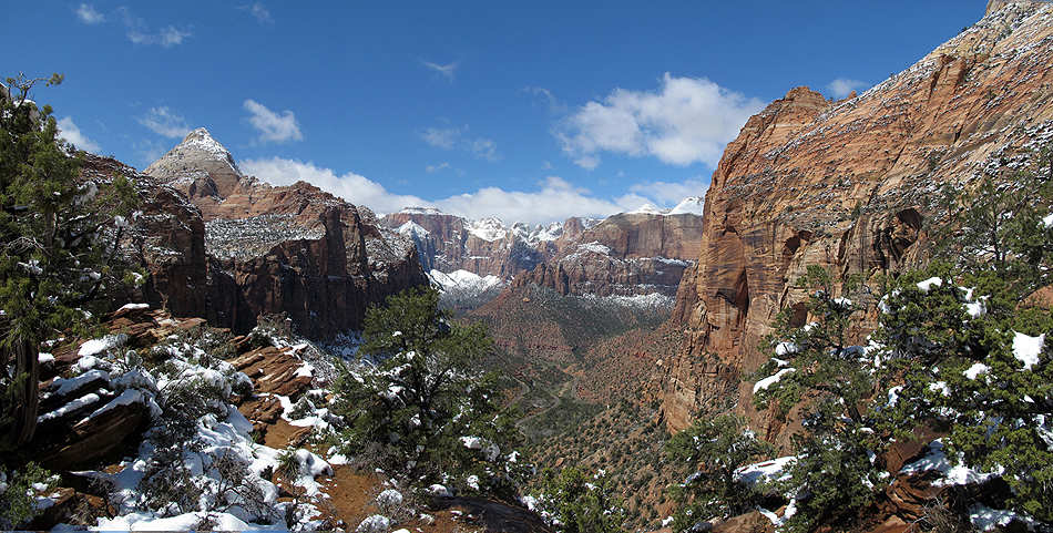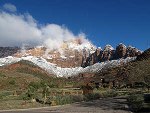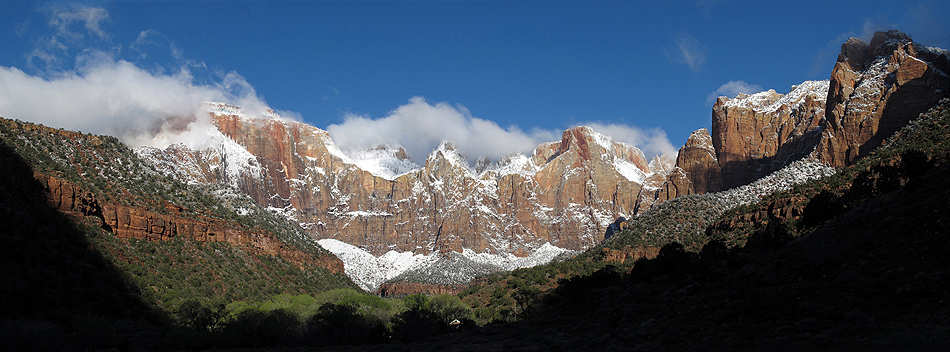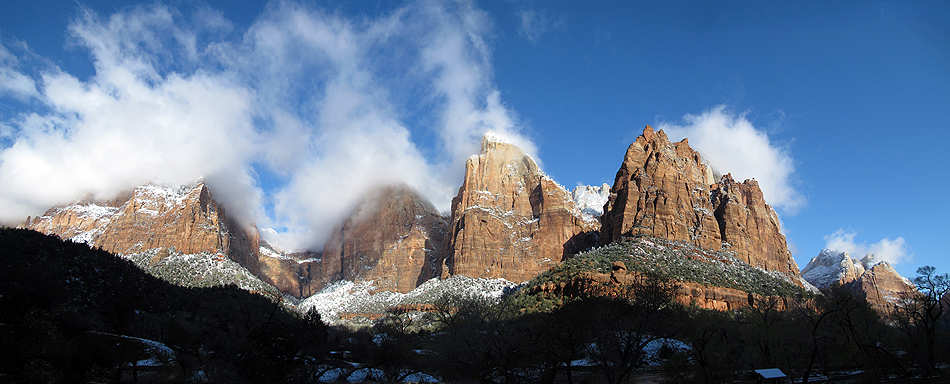 | Blick auf die frisch verschneiten "Towers of the Virgin" |