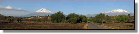 | Blick über San Nicolas de los Ranchos, auf die Vulkanberge Popocatepetl und Iztaccihuatl 'Puebla' |