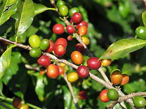An diesem Strauch sind die Früchte der Kaffeebohnen noch grün... |