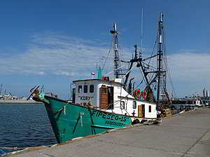 Ein am Quai ankerndes Fischerschiff. |
