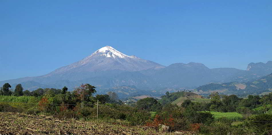 Der von der Strasse #143 gut ersichtliche Vulkan Pico der Orizaba. Er ist der höchste Berg Mexikos, doch leider wissen wir nicht genau wie hoch er wirklich ist. Die Angaben variieren zwischen 5610-5747m, je nach Buch, Karte oder Internet. 'Veracruz' |