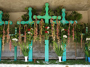 Viele Maya-Kreuze sind mit Pinienzweigen und diesen Bromelienblüten