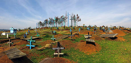 ... weit verstreut Gräber mit schlichten Kreuzen stehen. |