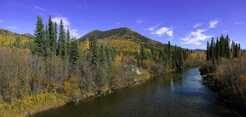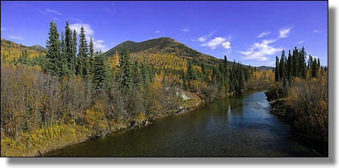 Blick über den geruhsamen Liard River, ... |