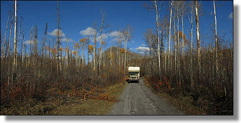 Eine mit Schlaglöchern versehene Piste führt uns zum Alaskahighway zurück und |
