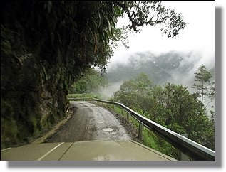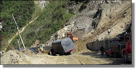 Kaum hatten wir diese Stelle passiert, rutschte, von diesem steilen Abhang, erneut etwas Erde auf die Fahrbahn und rammte den passierenden Lastwagen. |