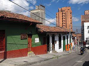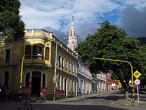 Blick von der Iglesia de Nuestra Senora del Carmen auf die Carrera 5, mit dem Teatro Camarin del Carmen. |