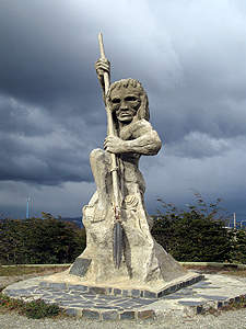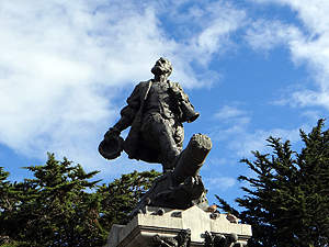 die Statue von Fernando Magellan und welcher über zwei Indigenas thront. |