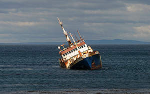 An diesem Küstenabschnitt rostet dieses gestrandete Schiff vor sich