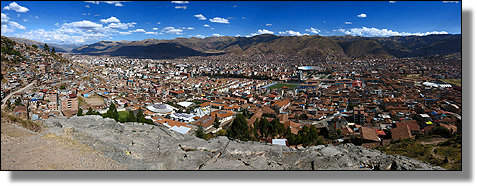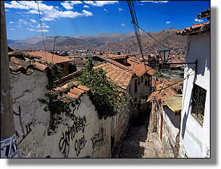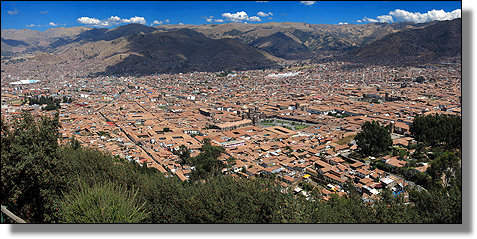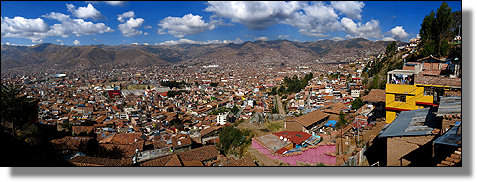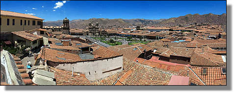 ... sich ausbreitende Dächermeer der Innenstadt von Cusco. |